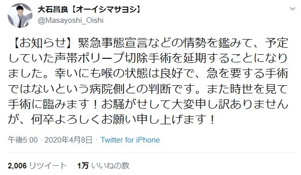 「昨日、政府より発令されました緊急事態宣言を受けまして、一両日中に予定しておりました声帯ポリープの切除手術を当面見合わせることとなりました。 緊急を要する手術ではないこと、現時点での症状が悪化していないことなど、今回手術を予定していた病院と相談の結果の判断でございます。」