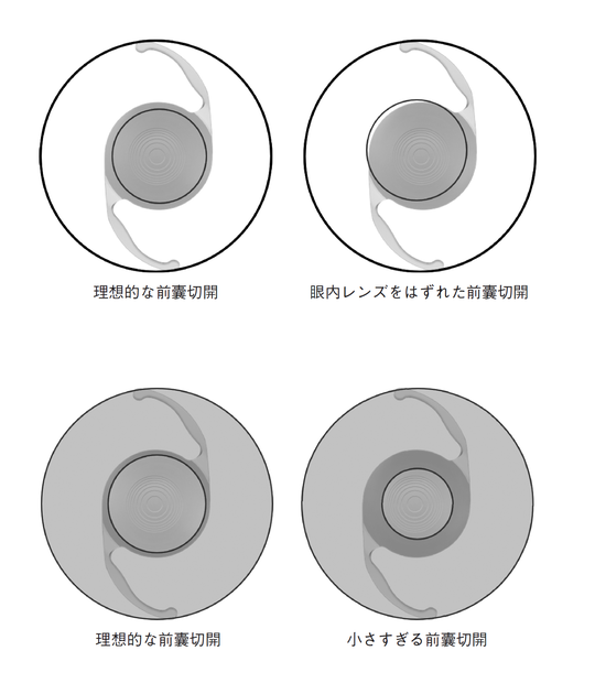術後数ヶ月経って嚢の収縮が起きた後も360度カバーしていることが重要です。このためには、できるだけ前嚢切開が正円で中心部にあり適切な大きさであることが重要なのです。