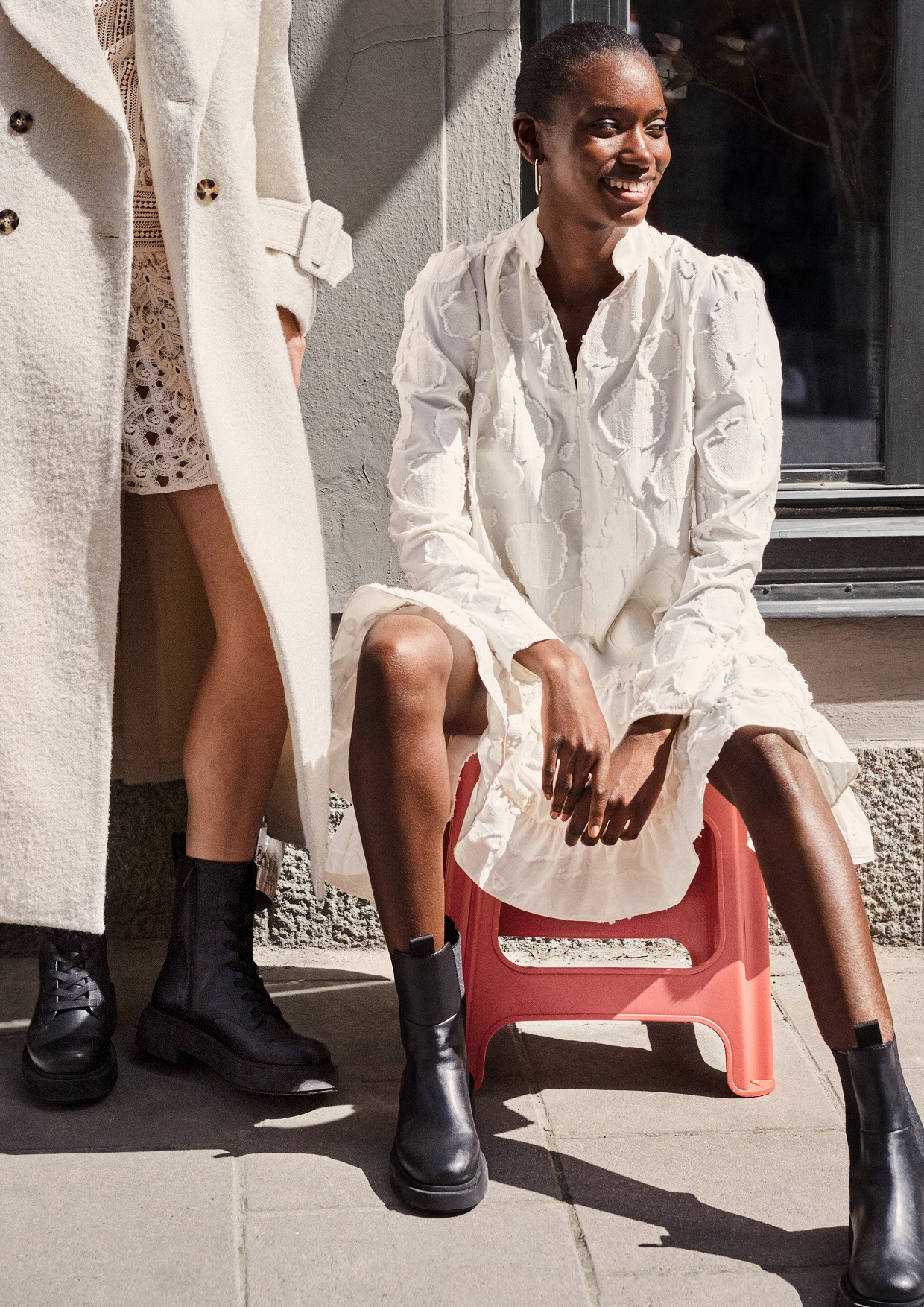 이번 가을 시즌 H&M은 유행에 구애받지 않는 디자인의 힘과 믹스 매치 스타일에 중점을 두었다. 레이스 드레스에 오버사이즈 테일러드 코트를 걸치고 청키한 부츠를 신는 스타일링이 대표적이다.